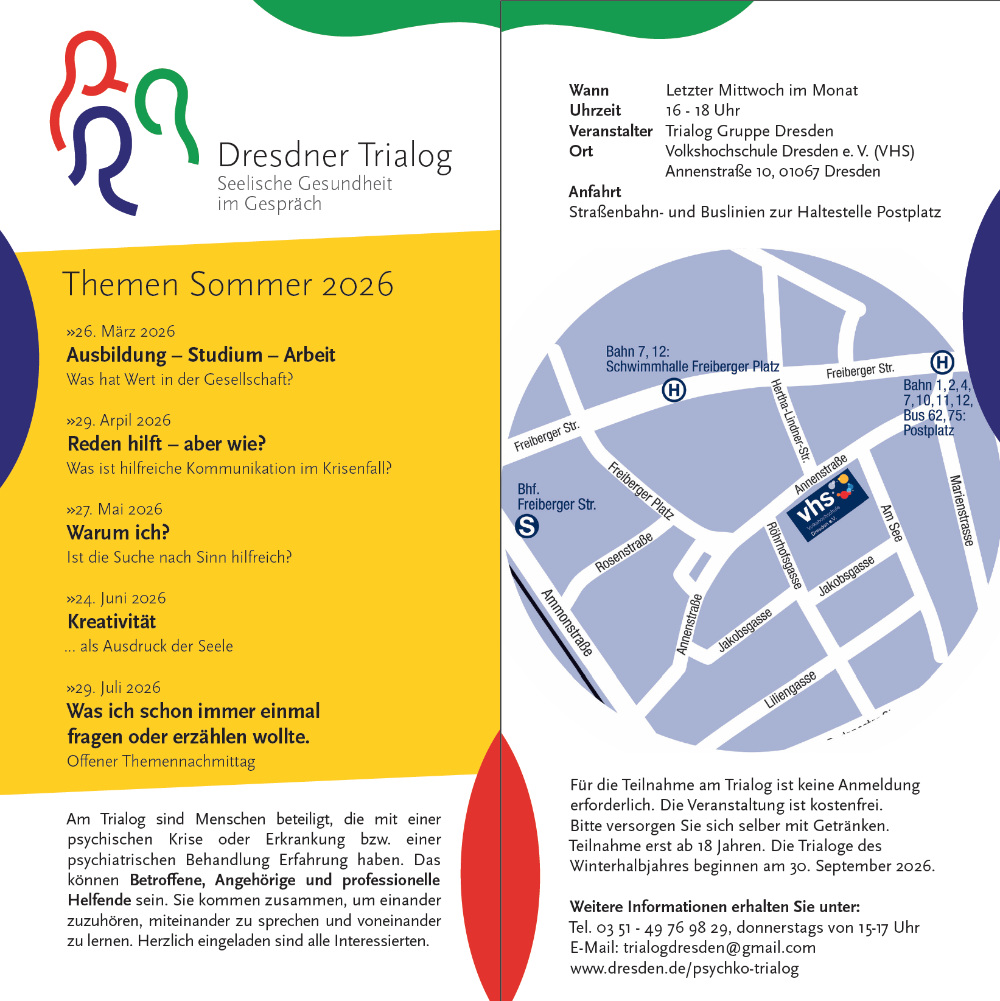 Am Trialog sind Menschen beteiligt, die mit einer psychischen Krise oder Erkrankung bzw. einer psychiatrischen Behandlung Erfahrung haben. Das können Betroffene, Angehörige und professionelle Helfende sein. Sie kommen zusammen, um einander zuzuhören, miteinander zu sprechen und voneinander zu lernen.